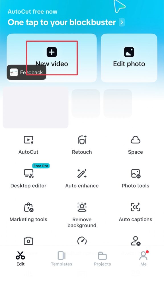 2 Start a New Project: Tap Start New Project and choose the ‘Movie’ option at the bottom.