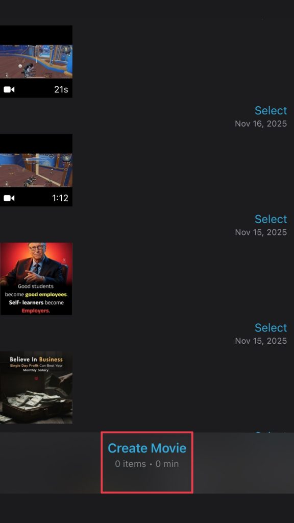3 Import Your Clip: Select the video clip you want to speed up from your camera roll and tap “Create Movie” at the bottom of the screen.